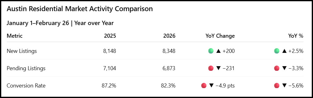 Austin residential (Jan 1–Feb 26): new listings are now up 2.5% YoY, while pending contracts remain down 3.3% YoY, pushing conversion off 5.6%. Supply is running ahead of last year. Demand is still catching up.